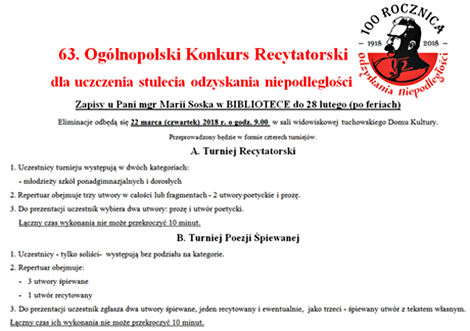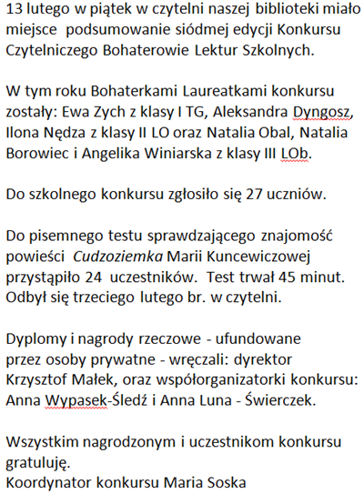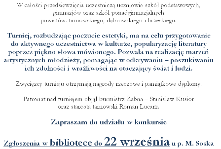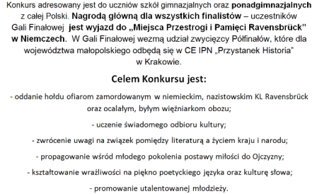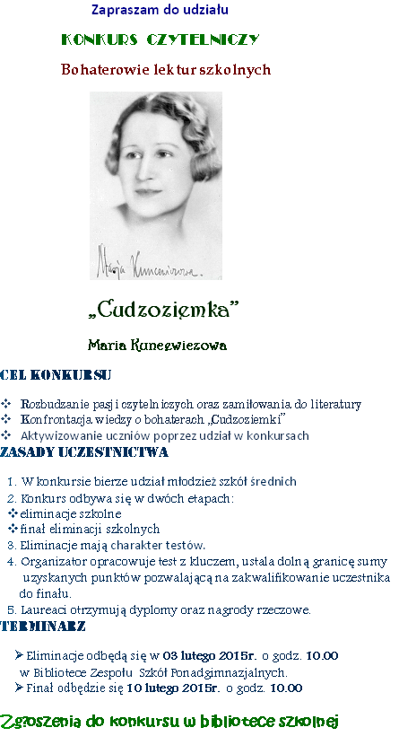 Informacje dotyczące: regulaminu, elektronicznego formularza zgłoszeniowego, wykazu lektur i terminów I i II etapu konkursu udziela mgr Maria Soska