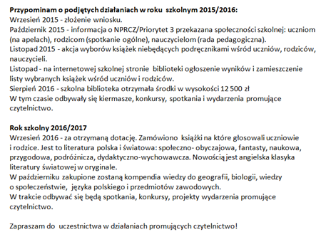 Priorytet 3: Rozwijanie Zainteresowań Uczniów Przez Promowanie i Wspieranie Rozwoju Czytelnictwa Wśród Młodzieży, W Tym Zakup Nowości Wydawniczych Cel główny programu: Wzmocnienie zainteresowań i aktywności czytelniczej uczniów przez promowanie i uatrakczyjnienie księgozbioru bibliotek szkolnych poprzez zakup książek niebędących podręcznikami.