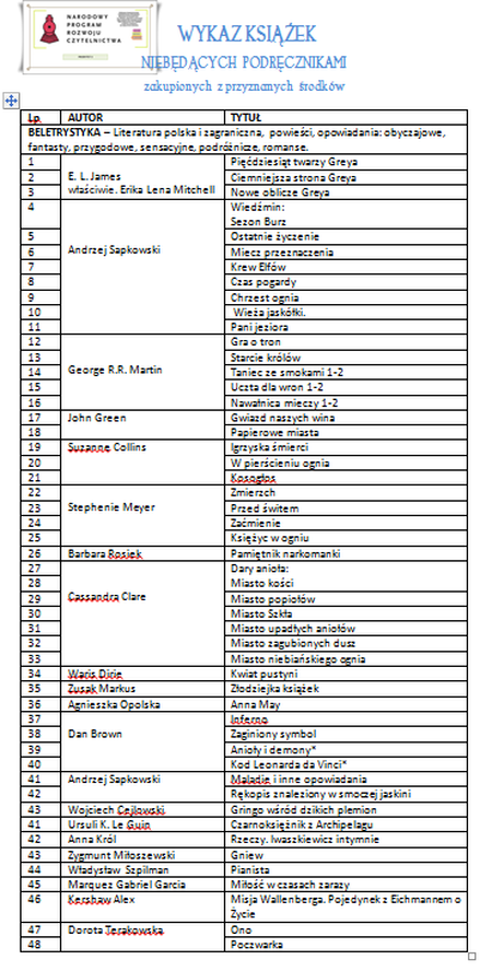 Witam, Poniżej zamieszczam na waszą prośbę listę zakupionych książek do biblioteki Życzę Miłej lektury