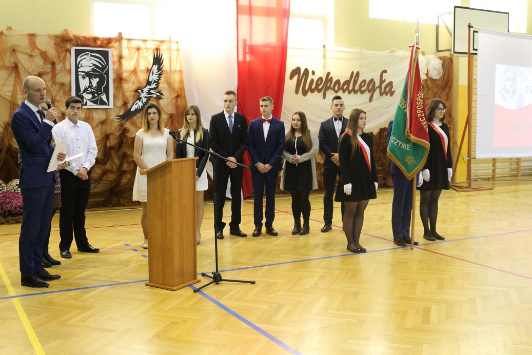 Tegoroczne obchody Święta Szkoły miały charakter patriotyczny. Podczas uroczystości Dyrektor ZSP – pan Krzysztof Małek przybliżył zebranym okoliczności odzyskania przez Polskę niepodległości, podkreślił również zasługi wybitnych postaci, których działalność wpłynęła na przyspieszenie tego procesu. Zebrani goście wygłosili okolicznościowe mowy, a Burmistrz Miasta i Gminy Zakliczyn – pan Dawid Chrobak podarował Szkole flagę od Prezydenta RP. |