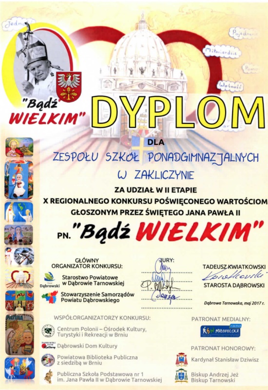 Wyróżnienie dla ZSP za udział w X Regionalnym Konkursie poświęconym wartościom głoszonym przez świętego Jana Pawła II pt. Bądź Wielkim