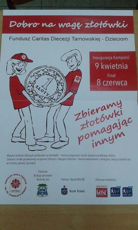 DOBRO NA WAGĘ ZŁOTÓWKI Weź udział w kampanii i wesprzyj swoich kolegów i koleżanki, którzy potrzebują wsparcia finansowego na rehabilitacje lub leczenie. Uruchom wyobraźnie i włącz swoich bliskich, sąsiadów, znajomych. Liczy się każda darowana złotówka. Pomóż innym. Dobro wróci do Ciebie! Pamiętaj! Dla klasy, która zbierze największa kwotę czeka niespodzianka. Liczymy na Was! Kampania trwa do 29 maja 2017r. Wolontariusze Szkolnego Koła Caritas |