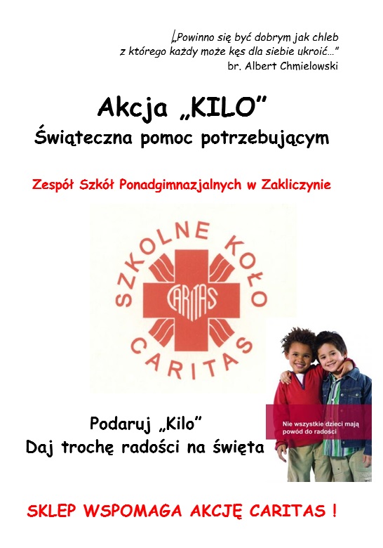 Jak co roku od 9 lat wolontariusze Szkolnego Koła Caritas działającego w naszej szkole zorganizowało „Akcję Kilo”. To zbiórka żywności zorganizowana w sklepach na terenie Zakliczyna. Osoby kupujące towar w sklepach oznaczonych naszym plakatem mogły zrobić zakupy i podzielić się tym z potrzebującymi. |