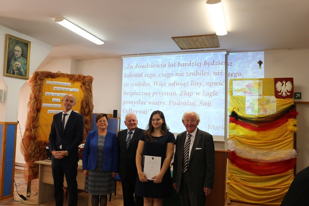 Z przyjemnością chciałabym poinformować, że dwoje uczniów naszej szkoły: Mateusz Budzyn - ucz.kl. 2 TBG oraz Klaudia Nieć- ucz. kl. 3 LO zostali laureatami konkursu europejskiego. Miło nam było gościć w naszej szkole:p. Burmistrza Miasta -p. Dawida Chrobaka, p. Jerzego Panterę, p. Jerzego Soskę oraz p. Martę Aleksiewicz. Gośćmi honorowymi byli państwo: Rosemarie i Manfred Däuwel, którzy wręczyli nagrody i dyplomy uczniom szkół podstawowych oraz średnich.