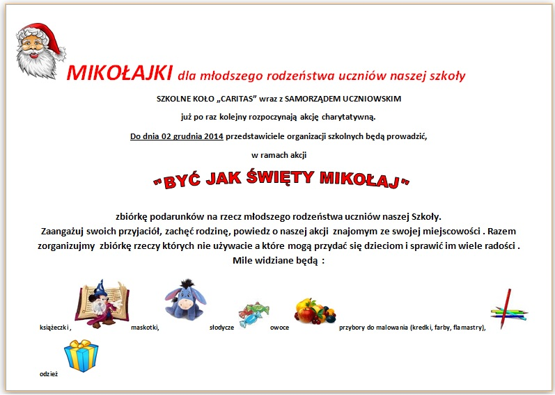 Radość, uśmiech, świetna zabawa to określenia pasujące do tegorocznych „Mikołajek”, które po raz dziesiąty zorganizowało Szkolne Koło Caritas i Samorząd Uczniowski działające przy Zespole Szkół Ponadgimnazjalnych w Zakliczynie. Młodsze rodzeństwo uczniów naszej szkoły miało możliwość spotkania się z Mikołajem, uczestnictwa w wielu zabawach i konkursach zdobywając nagrody przygotowane prze sponsorów. Konkursy w których mogli brać udział to: plastyczny, recytatorski, wokalny, oraz wiele sportowych. Całą uroczystość oraz zabawy i konkursy prowadzili członkowie SKC. Oprócz tego mogli regenerować siły w trakcie poczęstunku przygotowanego przez wolontariuszy. Dodam tylko, że Mikołajki organizujemy dla tych, których rodzice znaleźli się w trudnej sytuacji materialnej i nie mogą zapewnić swoim pociechom paczek mikołajkowych. Przychodzą też rodzice z własnymi paczkami, chcący aby ich dzieci uczestniczyły we wspólnych zabawach. Atmosfera na tej uroczystości jest dobrze znana naszym uczniom i rozniosła się szerokim echem w środowisku. Dlatego też co roku zwiększa nam się ilość uczestników imprezy. Mimo, ze ograniczyliśmy wiek uczestników do 10 lat zgłosiło nam się 77 dzieci. Razem z nimi przyszło również starsze rodzeństwo, którym nie przysługiwała paczka Mikołajkowa, ale przyciągnęła ich atmosfera zabawy. To chyba najlepsze świadectwo jak dzieci czują się w naszej szkole na tej uroczystości.