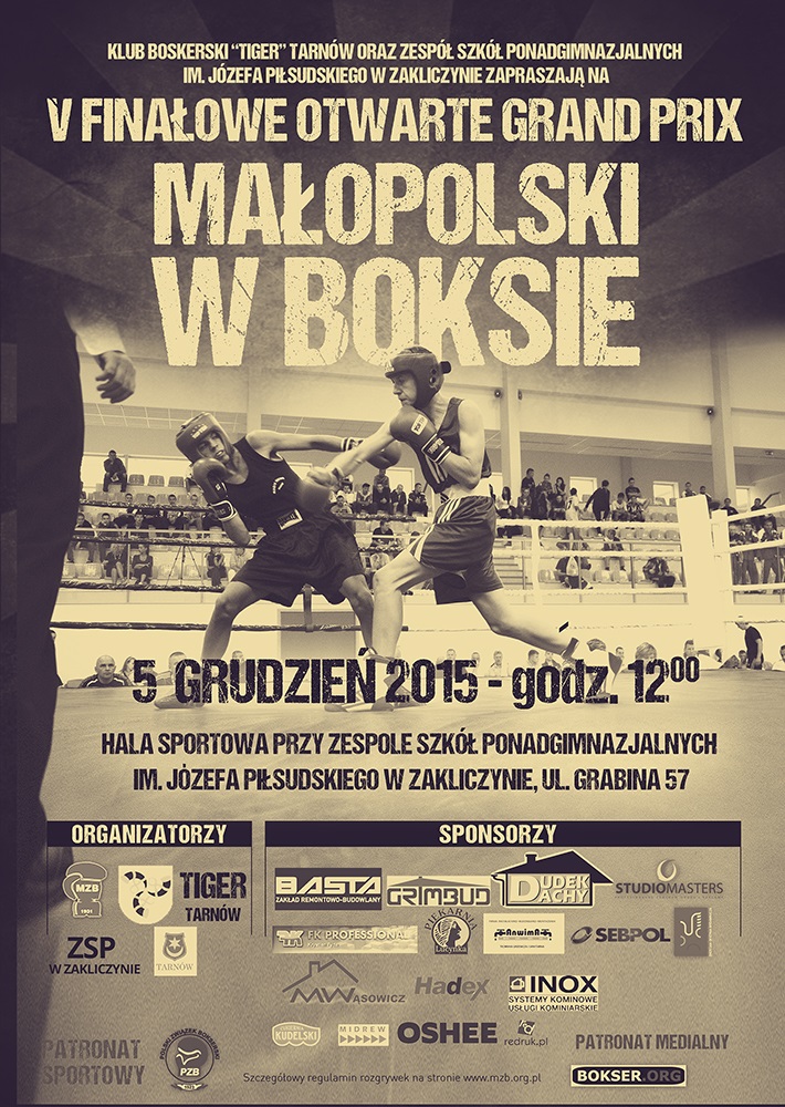 Z przyjemnością informujemy, że hala Zespołu Szkół Ponadgimnazjalnych już po raz piąty była miejscem zawodów sportowych o randze krajowej. Hala ZSP w Zakliczynie – V Otwarty Finał Grand Prix Małopolski w boksie 5 grudnia 2015r. w hali sportowej zespołu szkół odbyły się V Finałowe Otwarte Grand Prix Małopolski w boksie. W ramach imprezy odbyło się czterdzieści cztery walki w różnych kategoriach wagowych. Wydarzenia były na żywo relacjonowane na portalu bokser.org. Reemisja dostępna pod linkiem http://www.bokser.org/content/2015/12/05/144611/index.js. |