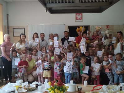 Kolejne warsztaty gastronomiczne dla Przedszkolaków  W dniach 5-6.06.2018 r. na Warsztatach Szkolnych Zespołu Szkół Ponadgimnazjalnych w Zakliczynie odbyły się kolejne Warsztaty gastronomiczne dla Przedszkolaków. 5 czerwca gościliśmy dwa przedszkola z Siemiechowa. 6 czerwca przybyły do nas dzieciaki z Publicznego Przedszkola z Lusławic. Maluchy przybyły w towarzystwie rodziców i opiekunów, wśród których było kilka naszych absolwentek, które miło wspominają czas spędzony w naszej szkole. Przybyłych gości przywitali nasi dyrektorzy – Krzysztof Małek i Jacek Świderki. Panowie dyrektorzy szybko nawiązali kontakt z dziećmi, w swoich krótkich wprowadzeniach poinformowali o programie warsztatów i zadaniach jakie stoją przed nimi, równocześnie życzyli wszystkim miłego pobytu w naszej szkole. Następnie dzieci ubrane w piękne fartuszki i czepki kucharskie, przystąpiły do zaplanowanych zajęć. Dzieci podzielono na trzy grupy. Pierwsza zajęła się wyrobem pizzy , druga wypiekiem ciasteczek, trzecia malowała gotowe ciasteczka. Dzieci z zapałem przystąpiły do zajęć, widać było duże zaangażowanie w powierzone im zadania, a uśmiech na twarzach to dowód że sprawiało im to dużo radości i przyjemności. W pracy pomagali, jednocześnie nadzorowali uczniowie klas gastronomicznych, a także Kubuś Puchatek, Koziołek Matołek i Tygrysek. Po ciężkiej pracy przyszła pora na przyjemności , dzieci degustowały wyroby które same wcześniej wyprodukowały. Jednocześnie organizatorzy przygotowali niespodziankę w postaci gorącej czekoladowej z ekspresu.