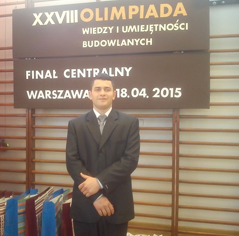 W dniach 16-18 kwietnia 2015 r. w Warszawie odbyły się zawody centralne XXVIII Olimpiady Wiedzy i Umiejętności Budowlanych. W zawodach uczestniczyło 82 uczniów z 45 szkół z całej Polski. Dzięki intensywnej pracy i wynikom osiągniętym na zawodach okręgowych Olimpiady nasz uczeń Krzysztof Ojczyk dostąpił zaszczytu uczestnictwa w tych prestiżowych zawodach. Zdobyta ilość punktów pozwoliła mu uplasować się na 38 miejscu, a co ważniejsze uzyskał tytuł finalisty Olimpiady Wiedzy i Umiejętności Budowlanych. Tytuł ten daje mu prawo do przyjęcia bez postępowania kwalifikacyjnego na studia na wydziałach budownictwa w uczelniach technicznych, a także na inne wybrane kierunki techniczne wg uchwał senatów uczelni oraz prawo do zwolnienia z etapu pisemnego egzaminu potwierdzającego kwalifikacje zawodowe. |