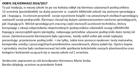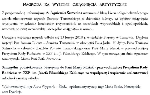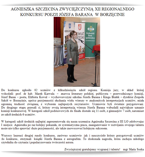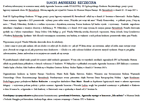 pełna relacja z sukcesu Agnieszki na stronie szkoły: