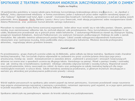 Monodram Andrzeja Jurczyńskiego "Spór o Zamek" w ZSP im. J. Piłsudskiego w Zakliczynie Organizatorki: mgr A. Wypasek - Śledź, mgr A. Luna - Świerczek i mgr B. Lasota
