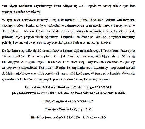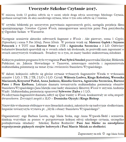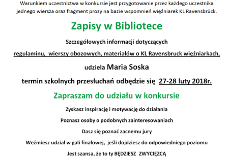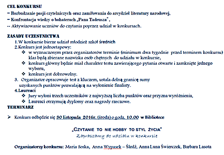 Informacje dotyczące: regulaminu, elektronicznego formularza zgłoszeniowego, wykazu lektur i terminów I i II etapu konkursu udziela mgr Maria Soska
