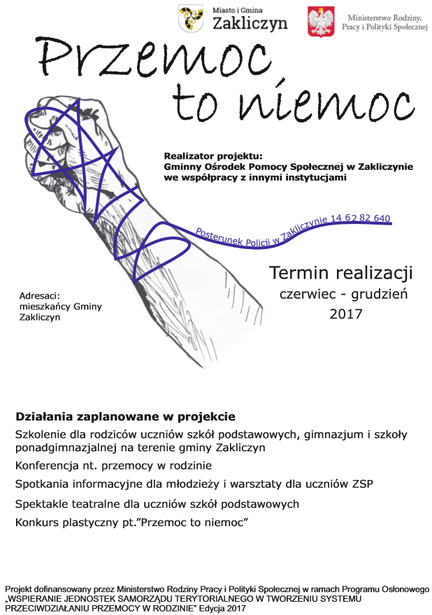 Od września w Zespole Szkół Ponadgimnazjalnych w Zakliczynie trwa realizacja projektu „Przemoc to niemoc”. Celem projektu jest „podniesienie świadomości społecznej u mieszkańców gminy Zakliczyn na temat zjawiska przemocy w rodzinie.” Odbyło się już szkolenie dla rodziców podczas zebrania, konferencja z udziałem przedstawicieli instytucji zajmujących się pomocą. Uczniowie wszystkich klas uczestniczą w zajęciach prowadzonych przez pedagoga szkolnego Zwieńczeniem działań projektowych jest gminny konkurs plastyczny związany z tematyką przemocy. Zachęcam uczniów do przygotowania prac konkursowych. Autorzy zwycięskich prac otrzymają nagrody rzeczowe. Poniżej dostępny regulamin.