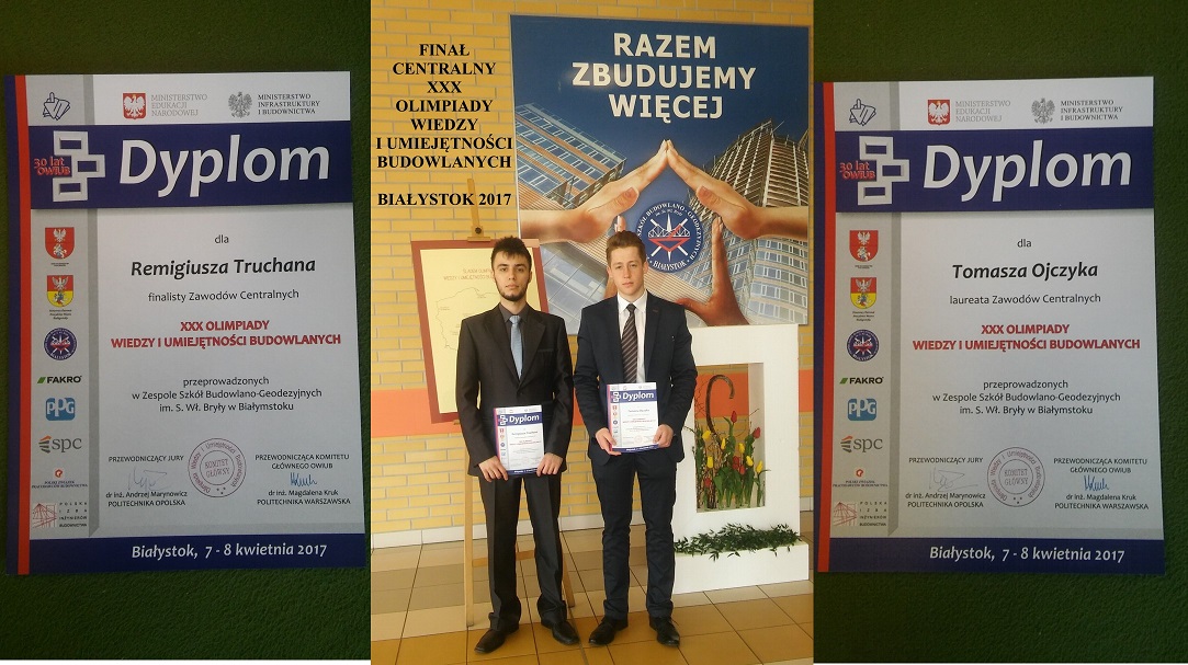 W dniach 6-8 kwietnia 2017 r. w Białymstoku odbyły się zawody centralne XXX Olimpiady Wiedzy i Umiejętności Budowlanych. W zawodach udział wzięło 90 uczniów z 49 szkół. Z naszej szkoły do etapu centralnego zakwalifikowało się dwóch uczniów z kl. IV TB: Tomasz Ojczyk i Remigiusz Truchan.