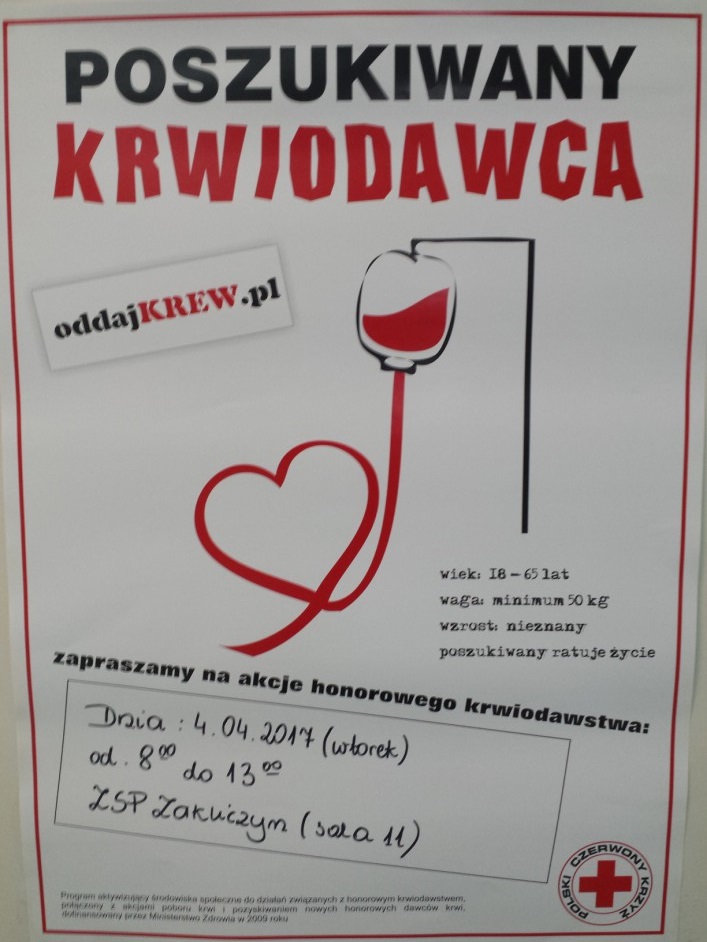 Dnia 4.04.2017 (wtorek) w ZSP w Zakliczynie odbędzie się kolejna już, coroczna akcja oddawania krwi. Zachęcamy i zapraszamy wszystkich sympatyków  naszej szkoły, byłych uczniów oraz osoby, które chciałyby w tej akcji wziąć udział. Akcja odbywa się w budynku szkoły, w sali nr 11 w godzinach od 8:00 do 12:00. Zapraszamy!