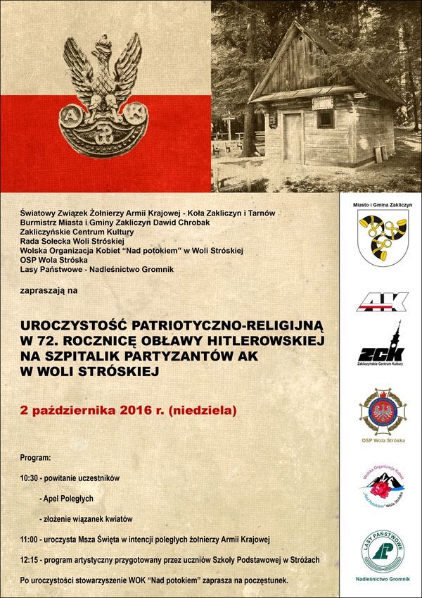 Zapraszamy nauczycieli, rodziców i młodzież naszej szkoły 02 października 2016 r. (niedziela) na Uroczystość patriotyczno-religijną, która odbędzie się w Woli Stróskiej. Bus szkolny ZSP odjedzie z zakliczyńskiego rynku o 9:45. mgr Marian Sojat