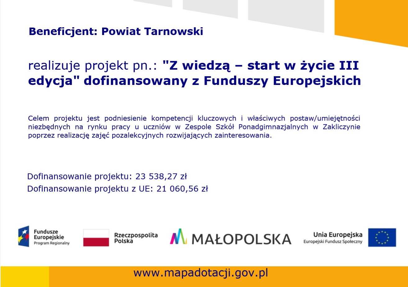 W związku z podpisaną umową o dofinansowania pomiędzy Małopolskim Centrum Przedsiębiorczości i Powiatem Tarnowskim 1 września 2016 roku rozpoczyna się realizacja zajęć w ramach projektu pn.: „Z wiedzą – start w życie” w Liceum Ogólnokształcącym i Technikum w Zespole Szkół Ponadgimnazjalnych w Zakliczynie w ramach 10 Osi Priorytetowej Wiedza i kompetencje, Działanie 10.1 Rozwój kształcenia ogólnego, Poddziałanie 10.1.4 Małopolska chmura edukacyjna dla typu projektu B. Małopolska chmura edukacyjna – część konkursowa Regionalnego Programu Operacyjnego Województwa Małopolskiego na lata 2014-2020. |