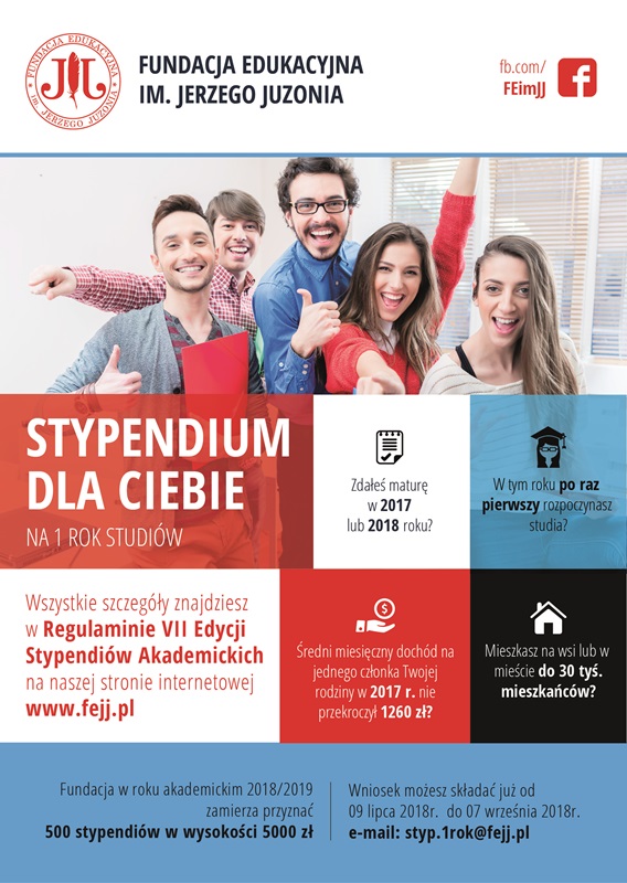 Fundacja Edukacyjna im. Jerzego Juzonia już 09 lipca 2018 roku rozpocznie rekrutację do VII Edycji stypendiów akademickich. Celem Fundacji jest zwiększanie szans edukacyjnych młodzieży z małych miejscowości, realizowane poprzez pomoc finansową, która niejednokrotnie jest jedyną szansą na podjęcie studiów wyższych w większych miastach. mgr Joanna Dobrzańska