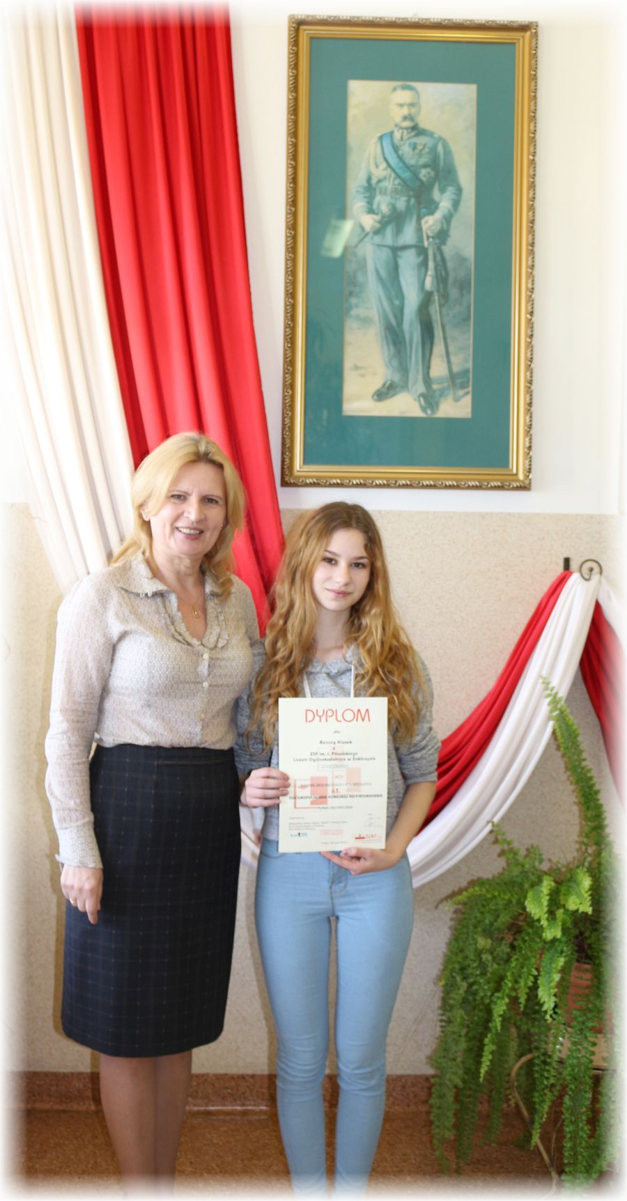 Z przyjemnością informuję, że Renata Kłusek uczennica klasy drugiej Liceum Ogólnokształcącego w marcu zdobyła wyróżnienie w 63 Ogólnopolskim Konkursie Recytatorskim w eliminacjach miejskich i powiatowych w województwie małopolskim. Nietuzinkowa i pełna ekspresji prezentacja prozy i recytacja wiersza przez Renatę przykuła uwagę sędziów i została nagrodzona wyróżnieniem.